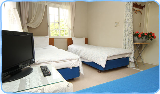 青を基調とした、どこか外国を思わせる清潔感溢れるお部屋です。 お部屋に咲くお花が館内にいながらにして、四季を感じさせてくれます。 しばし喧噪を忘れ、のんびりとお過ごしください。